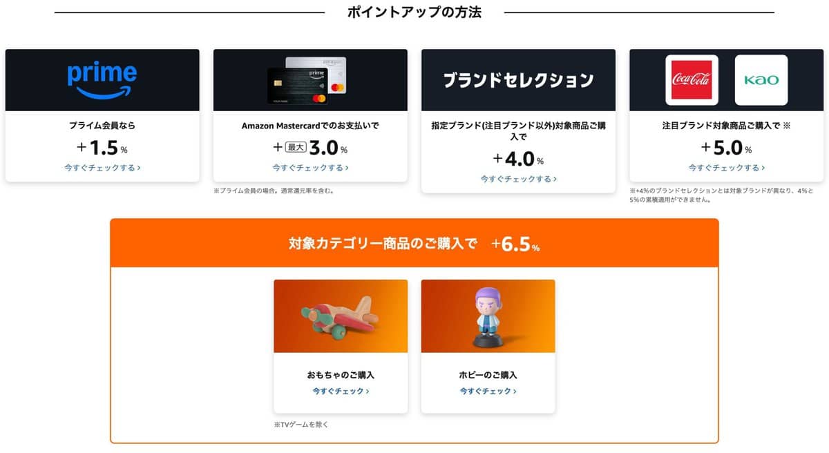 全商品が対象で、Amazonプライム会員は1.5%アップ、おもちゃ・ホビーは6.5%アップです!