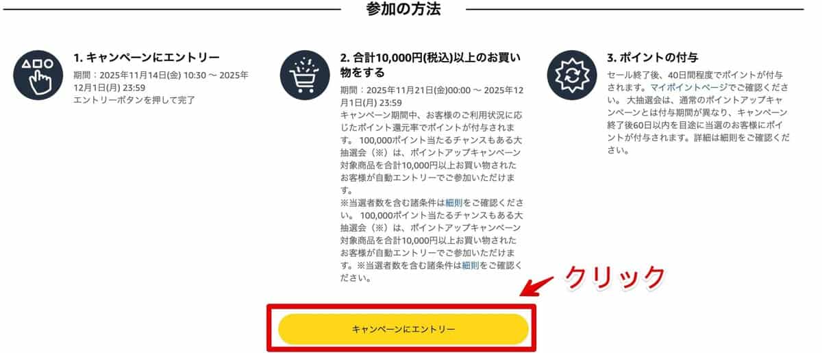 キャンペーンにエントリーを完了し、1万円以上お買い物すると、それぞれの条件ごとにポイントが付与されます。