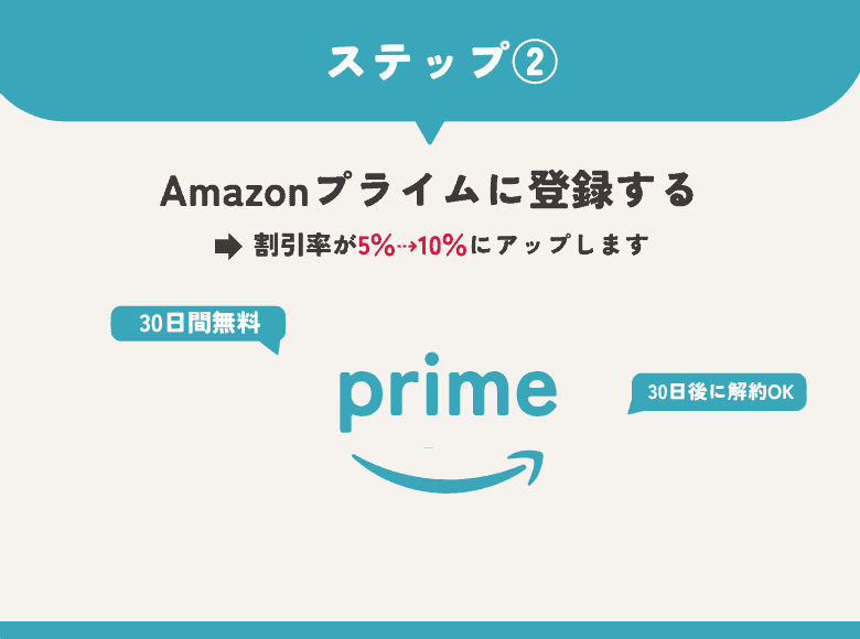 Amazonプライム会員ではない人は5%オフになってしまうので、Amazonプライム会員に登録して10%オフにしておきましょう。